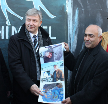 Regierenden Bürgermeister Klaus Wowereit eine Rolle mit Fotos und Signaturen der beteiligten Künstler übergeben.