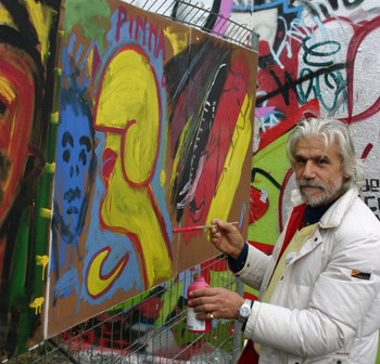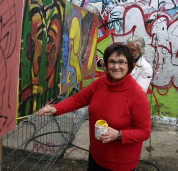 16 East Side Künstler trafen sich und bemalten symbolisch 5 Quadratmeter Leinwand direkt neben den Resten vom Bild Masken von Wjatscheslav Schljachow. Eingeladen waren ebenfalls Kultur- Staatssekretär André Schmitz, Bezirksbürgermeister Dr.Franz Schulz, Sybille Schulz vom Obersten Denkmalamt Berlin sowie Conny van Geisten vom Träger STERN.