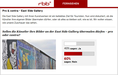 jetzt haben wir ein Zeitfenster für die nächsten 15 Jahre - Nehmt die East Side Gallery in die Stiftung Berliner Mauer auf. - Sofortiger Stopp der Baumaßnahmen auf dem Grundstück von Herrn Hinkel, es werden täglich Tatsachen geschaffen, die man nicht mehr