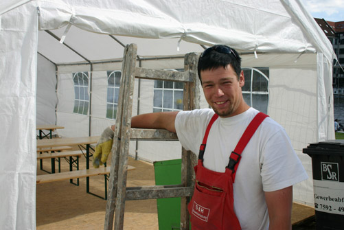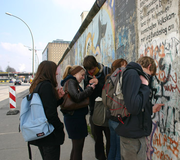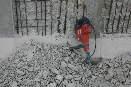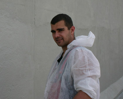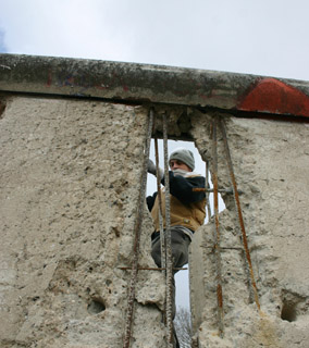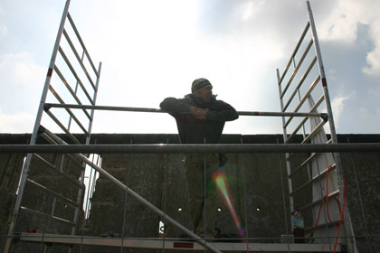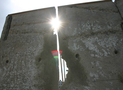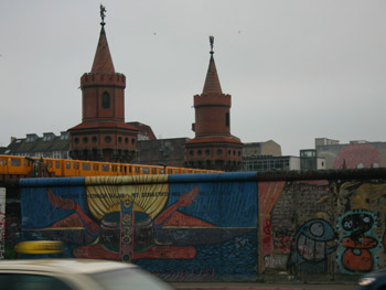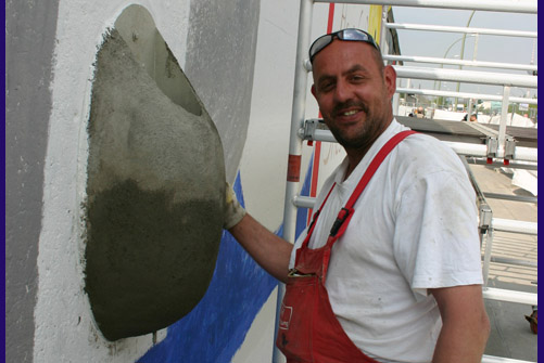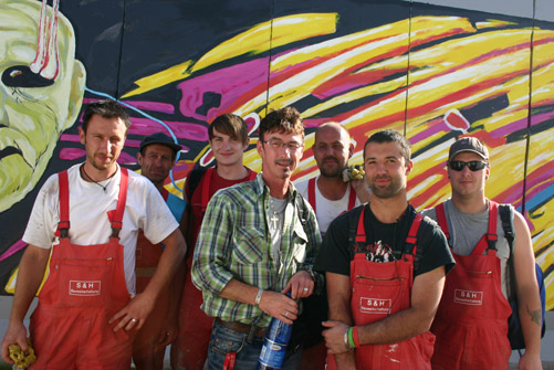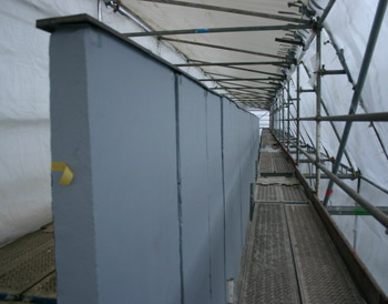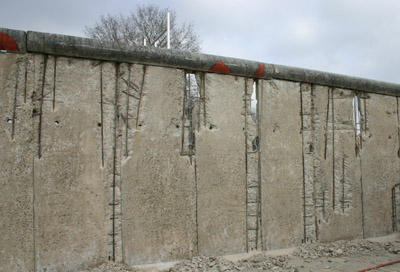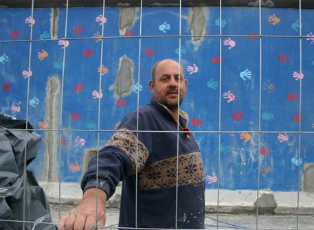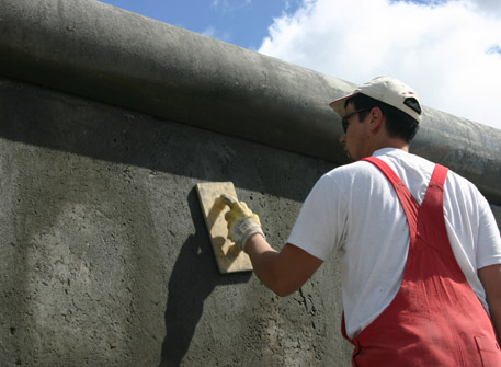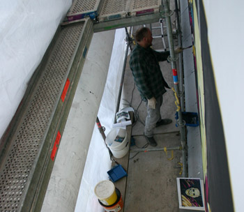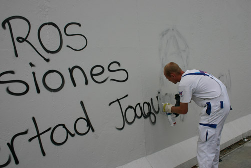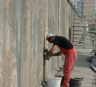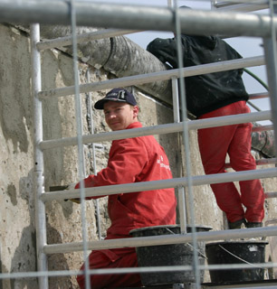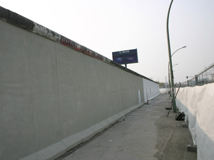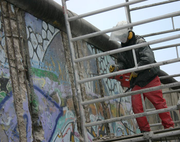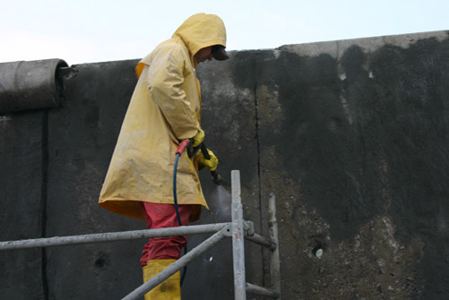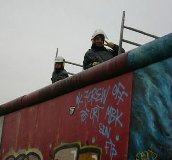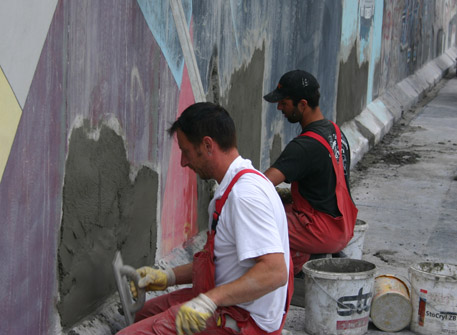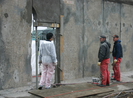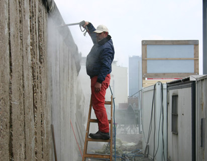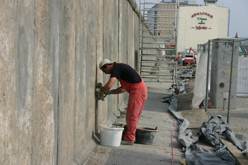 Die Sanierung schreitet voran. Zunächst sind die Presslufthämmer dran. Sie legen die Stahlbewehrungen in den Segmenten und zwischen ihnen frei. Anschließend werden sie mit Rostschutz mehrfach gestrichen. Jetzt wird die gesamte Oberfläche beidseitig mit 80° heißem Wasserdampf unter sehr hohem Druck bedampft, alles heruntergeholt, auch die Farbreste. Die Mauer ist anschließemnd einheitlich steingrau und sieht wie zu Ostzeiten aus. Ein seltener Anblick. Jetzt werden die Löcher, Offnungen und Zwischenräume von den Segmenten mit Spezialbeton zugeschmiert. Anschließend wird eine elastische Schicht aus Beton und Glasfasern aufgespachtelt, daruber wird 2 mal weiss grundiert. Jetzt erst können die Künstler ran und ihre Motive von 1990 an gleicher Stelle wieder auftragen.
